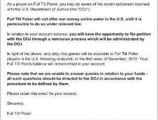 My main reason for today's post is to see how many of you out there recently received the email from Full Tilt about filing a petition with the U.S. Department of Justice (DOJ) to request any available account balance? I've included a pic of the email within this post for reference. I don't know about you, but I certainly don't have enough money in my account to try and cause a stink by contacting the DOJ directly regarding my funds. Maybe I'm being naive to think that avoidance keeps me out of the mix of potential issues, but what do I know? I'm sure there are folks out there with life changing amounts of money tied up that would warrant attempting next steps, but that's not the case with me. I always attempted to keep just the right amount of fun money available online in order to enjoy some occasional cash games or tourneys, without worrying that money I needed could be gone. I really do feel for folks who had a sizable amount on deposit with any gaming site that is now frozen.